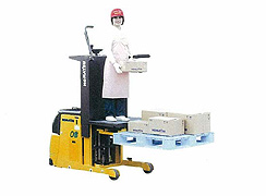 電動式の自走や揚降もできるハンドパレットリフトです。免許のない女性でも立ったまま操作できます。高い所の物をピッキングしながらの移動に便利です。1トンまで対応します。